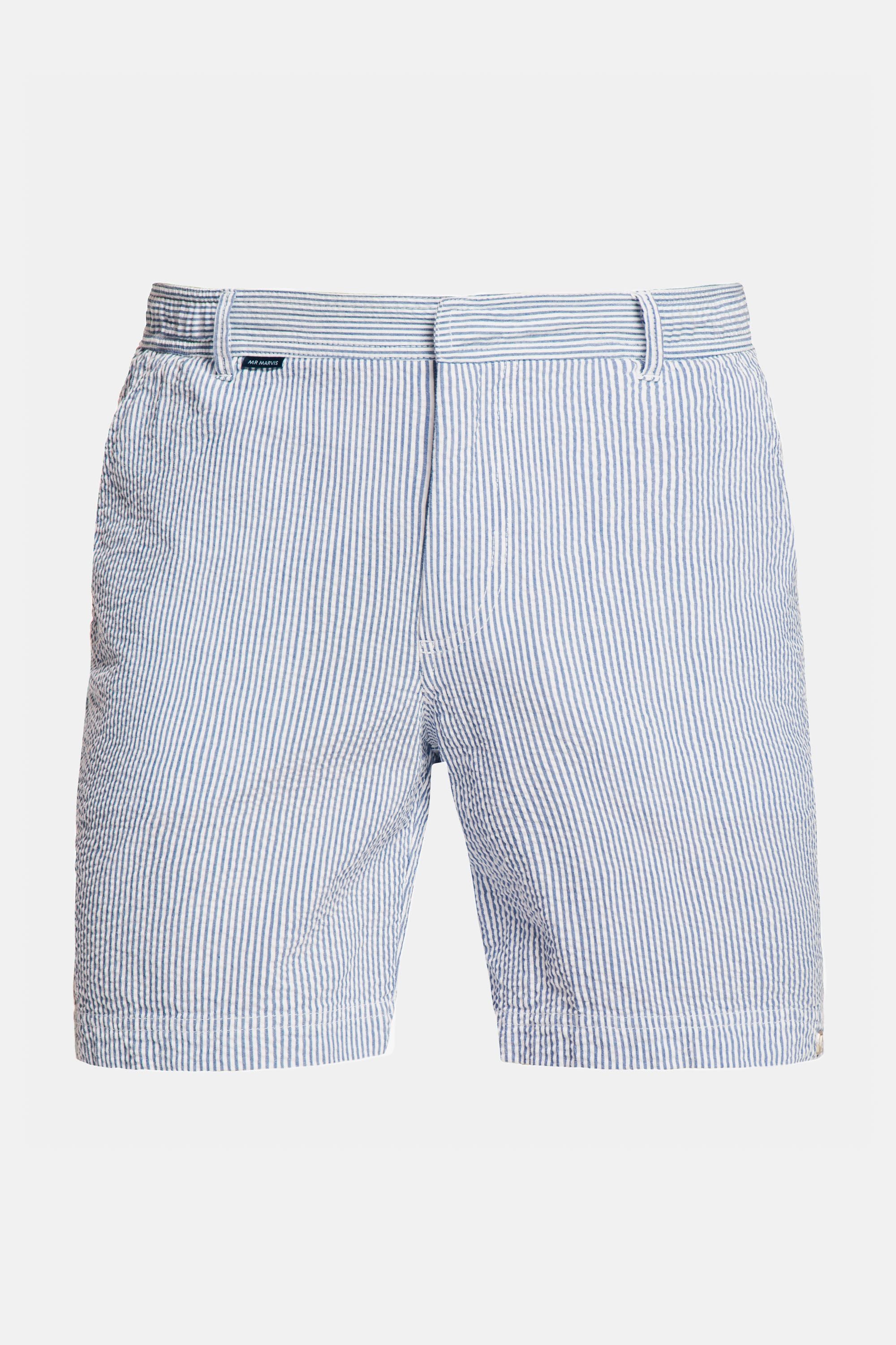 Ti presentiamo i The Catamarans seersucker: gli shorts da uomo di MR MARVIS in cotone 100% organico in blu scuro e righe bianche.